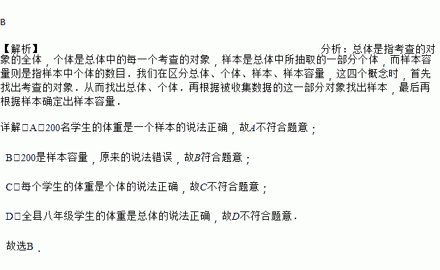 为了了解某区八年级学生的体重情况,从中抽取了200名学生进行体重测试.在这个问欢迎登陆全品中考网“题中,下列说法错误的是( )