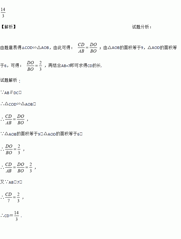 如图,已知梯形ABCD,AB∥DC,△AOB的面积等于9,△AOD的面积等于6,AB=7,求CD的长.