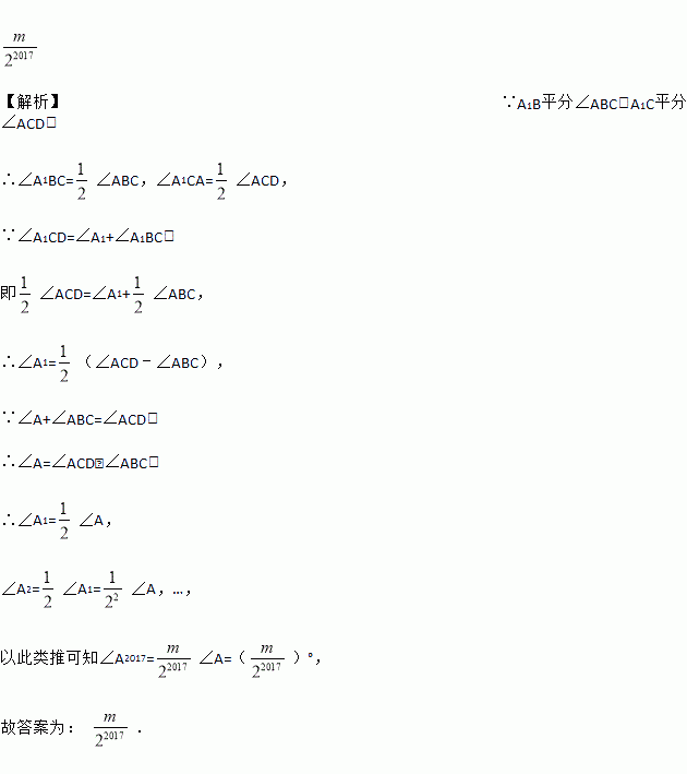 如图,在△ABC中,∠A=m°,∠ABC和∠ACD的平分线交于点A1,得∠A1;∠A1BC和∠A1CD的平分线交于点A2,得∠A2;…∠A2016BC和∠A20l6CD的平分线交于点A2017,则∠A2017=_____°.