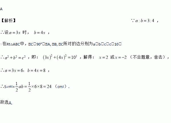 在Rt△ABC中,∠C=90°,∠A, ∠B, ∠C所对的边分别为a,b,c, 已知a∶b=3∶4,c=10,则△ABC的面积为( )