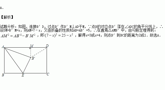(3分)如图,在矩形ABCD中,AB=5,BC=7,点E为BC上一动点,把△ABE沿AE折叠,当点B的对应点B′落在∠ADC的角平分线上时,则点B′到BC的距离为( )