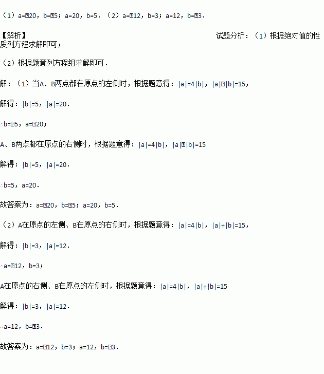 (2015秋•泗县校级月考)有A、B两点,在数轴上分别表示实数a、b,若a的绝对值是b的绝对值的4倍,且A、B两点的距离是15,求a、b的值.