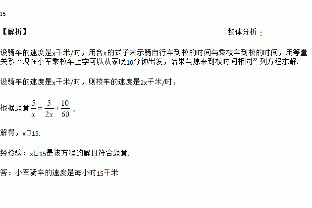 小军家距学校5千米,原来他骑自行车上学,学校为保障学生安全,新购进校车接送学生.若校车的速度是他骑车速度的2倍,则现在小军乘校车上学可以从家晚10分钟出发,结果与原来到校时间相同,试求小军骑车的速度.