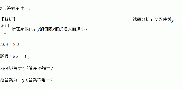 若双曲线所在的每一个象限内,y的值随x值的增大而减小,则满足条件的一个数值k为________.