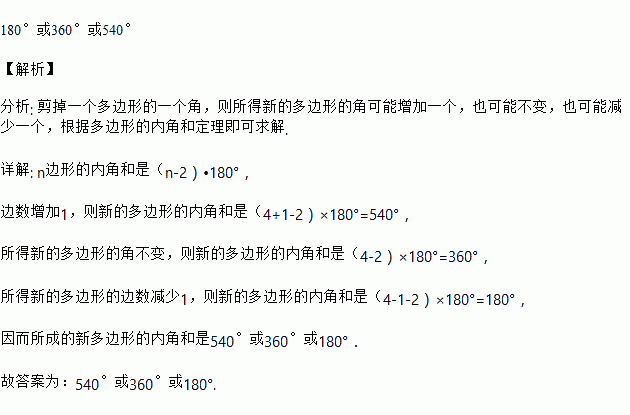 (题文)如果一个正方形被截掉一个角后,得到一个多边形,那么这个多边形的内角和是__________.