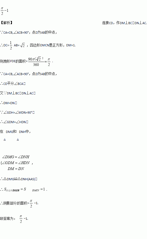 如图,在△ABC中,CA=CB,∠ACB=90°,AB=,点D为AB的中点,以点D为圆心作圆心角为90°的扇形DEF,点C恰好在弧EF上,则图中阴影部分的面积为________(结果保留π)