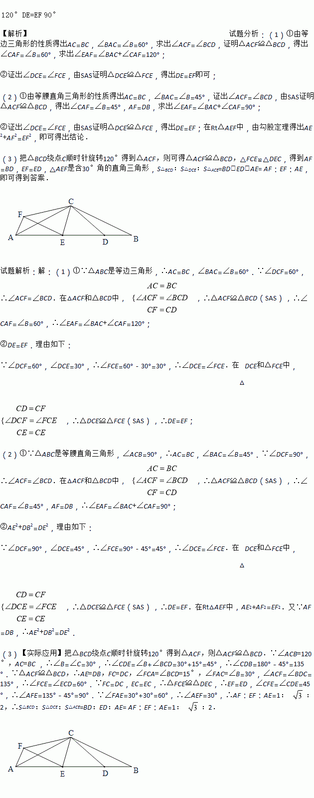 【实际应用】如图 3,△ABC 是一个三角形的余料.小张同学量得∠ACB=120°,AC=BC, 他在边 BC 上取了 D、E 两点,并量得∠BCD=15°、∠DCE=60°,这样 CD、CE 将△