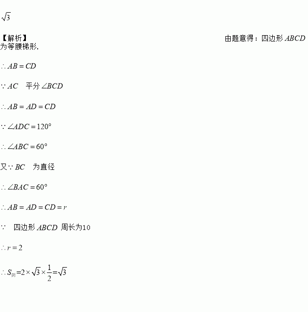 如图,已知点A、B、C、D均在以BC为直径的圆上,AD∥BC,AC平分∠BCD,∠ADC=120°,四边形ABCD的周长为10,则图中阴影部分的面积为__.