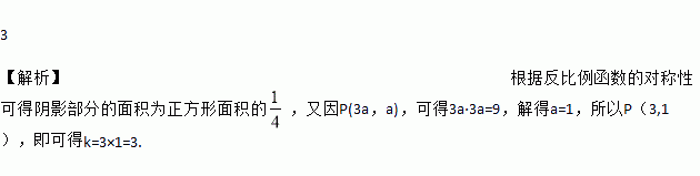 如图,在平面直角坐标系中,正方形的中点在原点O,且正方形的一组对边与x轴平行,点P(3a,a)是反比例函数y= (k>0)的图象与正方形的一个交点.若图中阴影部分的面积等于9,则k=____.
