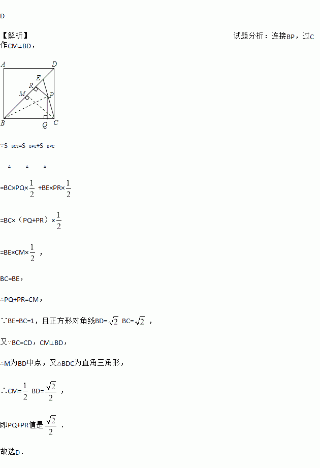 如图,E是边长为1的正方形ABCD的对角线BD上一点,且BE=BC,P为CE上任意一点,PQ⊥BC于点Q,PR⊥BE于点R,则PQ+PR的值是( )