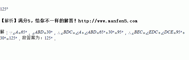 如图所示,△ABC中,点D,E分别是AC,BD上的点,且∠A=65°,∠ABD=∠DCE=30°,则∠BEC的度数是________.