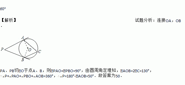 如图: PA,PB 切☉O于点A,B,点C 是☉O上的一点,且∠ACB=60°,则∠P=______________.