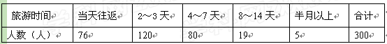 | 旅游时间 | 当天往返 | 2~3天 | 4~7天 | 8~14天 | 半月以上 | 合计 |