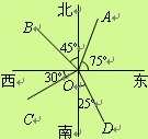 | A.OA方向是北偏东15º | B.OB方向是西北方向 |