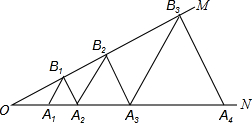 如图,已知:∠MON=30o,点A1、A2、A3在射线ON上,点B1、B2、B3…..在射线OM上,△A1B1A2. △A2B2A3、△A3B3A4……均为等边三角形,若OA1=l,则△A6B6A7的边长为【 】![]()