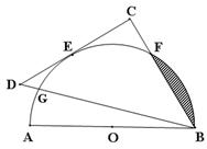 如图,AB为量角器(半圆O)的直径,等腰直角△BCD的斜边BD交量角器边缘于点G,直角边CD切量角器于读数为60°的点E处(即弧AE的度数为60°),第三边交量角器边缘于点F处. (1)求量角器在点G处的读数α(0°<α<90°);(2)若AB=10cm,求阴影部分面积.