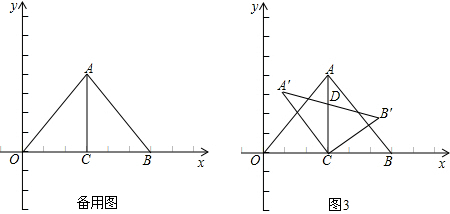 (3)如图3,在△ACB绕点C逆时针旋转的过程中,若设A′C所在直线与OA所在直线的交点为E,是否存在点E使△ACE为等腰三角形?若存在,求出点E的坐标;若不存在,请说明理由.