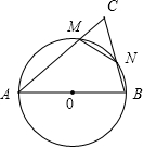 如图,以△ABC的边AB为直径画圆,与边AC交于M,与边BC交于N,已知△ABC的面积是△CMN面积的4倍,△ABC中有一个内角度数是另一内角度数的2倍,试计算△ABC三个内角的度数:________.