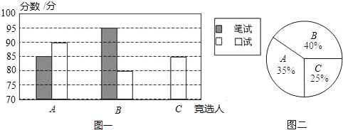 A,B,C三名大学生竞选系学生会主席,他们的笔试成绩和口试成绩(单位:分)分别用了两种方式进行了统计,如表和图一: