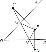如图,点P关于OA,OB的对称点分别为C、D,连接CD,交OA于M,交OB于N,若CD=18cm,则△PMN的周长为________cm.