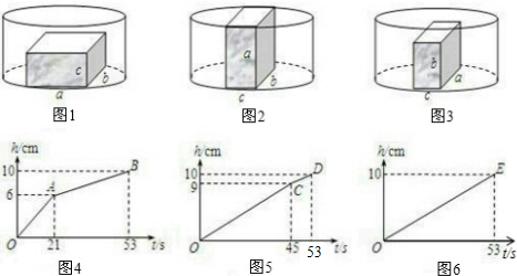 /s,直至注满水槽为止.石块可以用三种不同的方式完全放入水槽内,如图1~图3所示.在这三种情况下,水槽内的水深h cm与注水时间 t s的函数关系如图4~图6所示.根据图象完成下列问题: