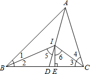 如图,AD是△ABC的角平分线,∠1=∠2,∠3=∠4,IE⊥BC于点E,