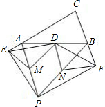 在△ABC中,D为AB的中点,分别延长CA、CB到点E、F,使DE=DF,过E、F分别作CA、CB的垂线相交于P,设线段PA、PB的中点分别为M、N.