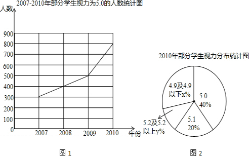 (2)由统计图中的信息可知,近几年学生视力为5.0的学生人数和每年与上一年相比,增加最多的是______年;若全校有3000名学生,请你估计2010年全校学生中视力达到5.0及5.0以上的约有______人.