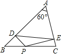 如图,点P是锐角△ABC的BC边上的动点,PD⊥AB于点D,PE⊥AC于点E,连接DE.若∠A=60°,BC=5,△ABC的面积等于10,则DE的最小值为________.