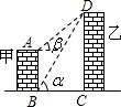 如图,线段AB,DC分别表示甲、乙两建筑物的高.某初三课外兴趣活动小组为了测量两建筑物的高,用自制测角仪在B处测得D点的仰角为α,在A处测得D点的仰角为β.已知甲、乙两建筑物之间的距离BC为m.请你通过计算用含α、β、m的式子分别表示出甲、乙两建筑物的高度.