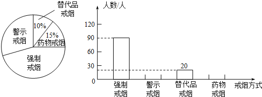 我们都知道主动吸烟和被动吸烟都危害着人类的健康.为此,联合国规定每年的5月31日为“世界无烟日”.为配合今年的“世界无烟日”宣传活动,我区某校九年级二班的同学们在城区内开展了以“我支持的戒烟方式”为主题的问卷调查活动,征求居民的意见,并将调查结果分析整理后,制成了如下统计图: