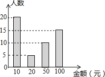 四川雅安发生地震后,某校九(1)班学生开展献爱心活动,积极向灾区捐款.如图是该班同学捐款的条形统计图.写出一条你从图中所获得的信息:________.