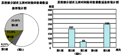 为了保护环境,某学校团支部组织部分团员利用周末时间到楠溪江边捡垃圾袋,表是五周时间捡到垃圾袋数量统计表,空缺部分可由扇形统计图和条形统计图看出.