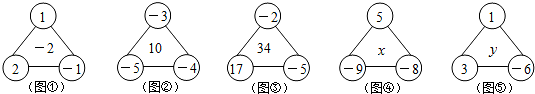 请用你发现的规律求出图④中的数 x 和图⑤中的数 y.