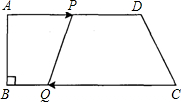 如图,在梯形ABCD中,AD∥BC,∠B=90°,AB=10cm,AD=18cm,BC=21cm,点P从点A出发,沿边AD向点D以1cm/s的速度移动,点Q从点C出发沿边CB向点B以2cm/s的速度移动,若点P与点Q同时出发,当这两点有一点运动到端点时,另一点也停止运动,没运动时间为t(秒).