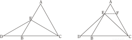 在等边三角形ABC中,点E在AB上,点D在CB的延长线上,且ED=EC,如图.试确定线段AE与DB的大小关系,并说明理由. |