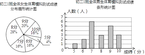 20 25 【解析】试题分析:(1)由条形图可得男生总人数,总人数减去男生人数可得女生人数; (2)根据平均数和众数定义可得. 试题解析:【解析】 (1)这个班共有男生1+2+6+3+5+3=20人,共有女生45﹣20=25人,故答案为:20、25; (2)甲的平均分为×(5+6×2+7×6+8×3+9×5+10×3)=7.9,女生的众数为8,补全表格如下: