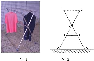如图1,小红家阳台上放置了一个晒衣架.如图2是晒衣架的侧面示意图,立杆AB、CD相交于点O,B、D两点立于地面,经测量:AB=CD=136cm,OA=OC=51cm,OE=OF=34cm,现将晒衣架完全稳固张开,扣链EF成一条直线,且EF=32cm.