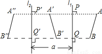 设直线l1和直线l2平行,且l1和l2间的距离为a.如果线段AB在l1的右侧,并设AB关于l1的对称图形是A′B′,而A′B′关于l2的对称图形是A″B″(如图),那么,线段AB和A″B″有什么关系?