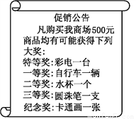 某商场进行有奖促销活动.活动规则:购买500元商品就可以获得一次转转盘的机会(转盘被分为5个扇形区域,分别是特等奖、一等奖、二等奖、三等奖、纪念奖),转动转盘停止后,指针指在哪个获奖区域就可以获得该区域相应等级奖品一件(奖品设置如图所示).商场工作人员在制作转盘时,将获奖区域扇形圆心角分配如下表: