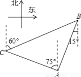 如图,在某监测点B处望见一艘正在作业的渔船在南偏西15°方向的A处,若渔船沿北偏西75°方向以40海里/小时的速度航行,航行半小时后到达C处,在C处观测到B在C的北偏东60°方向上,则B、C之间的距离为( )