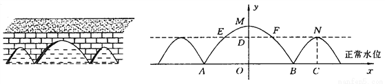 如图,三孔桥横截面的三个孔都呈抛物线形,两小孔形状、大小都相同,正常水位时,大孔水面宽度AB=20m,顶点M距水面6m(即MO=6m),小孔顶点N距水面4.5m(即NC=4.5m),当水位上涨刚好淹没小孔时,借助图中的直角坐标系,求此时大孔的水面宽度EF.