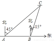 如图,有A、B两艘船在大海中航行,B船在A船的正东方向,且两船保持20海里的距离,某一时刻这两艘船同时测得在A的东北方向,B的北偏东15°方向有另一艘船C,那么此时船C与船B的距离是_______海里.(结果保留根号)
