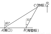 一艘观光游船从港口A以北偏东60°的方向出港观光,航行60海里至C处时发生了侧翻沉船事故,立即发出了求救信号,一艘在港口正东方向的海警船接到求救信号,测得事故船在它的北偏东30°方向,马上以40海里每小时的速度前往救援,海警船到达事故船C处所需的时间大约为_________小时(用根号表示).