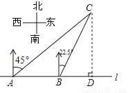 如图,在一笔直的海岸线l上有A、B两个观测站,AB=2km、从A测得船C在北偏东45°的方向,从B测得船C在北偏东22.5°的方向,则船C离海岸线l的距离(即CD的长)为( )