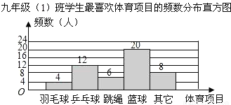 体育老师对九年级班学生“你最喜欢的体育项目是什么只写一项?”的问题进行了调查,把所得数据绘制成频数分布直方图如图由图可知,最喜欢篮球的学生的人数是