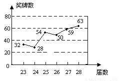 我国体育健儿在最近六届奥运会上获得奖牌的情况如图所示.最近六届奥运会上,我国体育健儿共获得________枚奖牌.