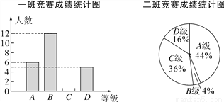 )6月5日是世界环境日,某校组织了一次环保知识竞赛,每班选25名同学参加比赛,成绩分别为A、B、C、D四个等级,其中相应等级的得分依次记为100分、90分、80分、70分,学校将某年级的一班和二班的成绩整理并绘制成如下统计图: