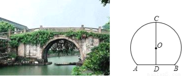 绍兴市著名的桥乡,如图,石拱桥的桥顶到水面的距离CD为8m,桥拱半径OC为5m,则水面宽AB为( )