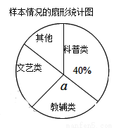 某校为了解2014年八年级学生课外书籍借阅情况,从中随机抽取了40名学生课外书籍借阅情况,将统计结果列出如下的表格,并绘制成如图所示的扇形统计图,其中科普类册数占这40名学生借阅总册数的40%.